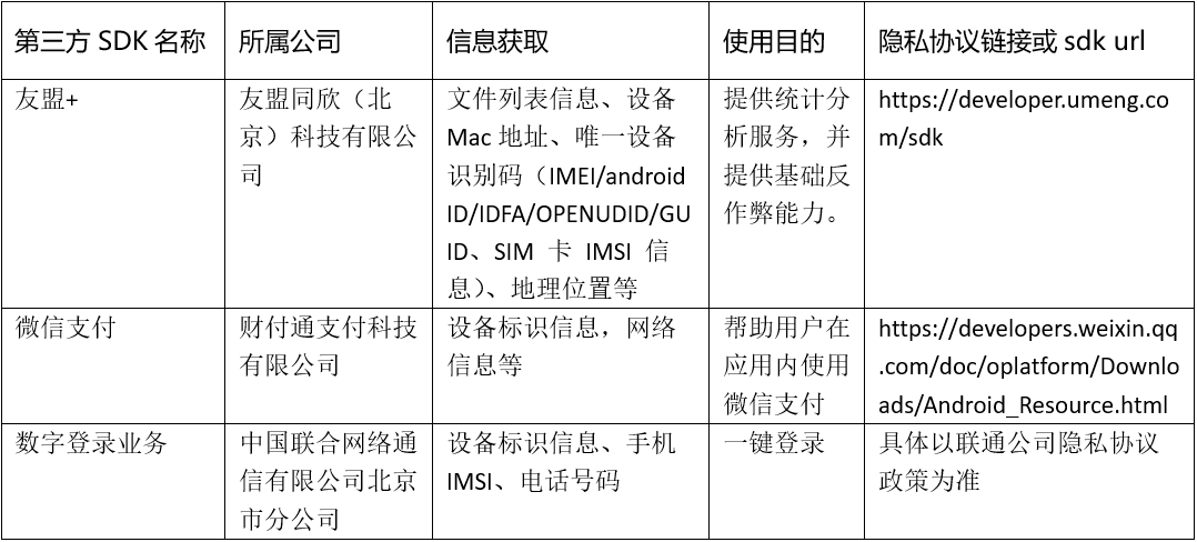 以下为接入第三方的SDK明细说明: